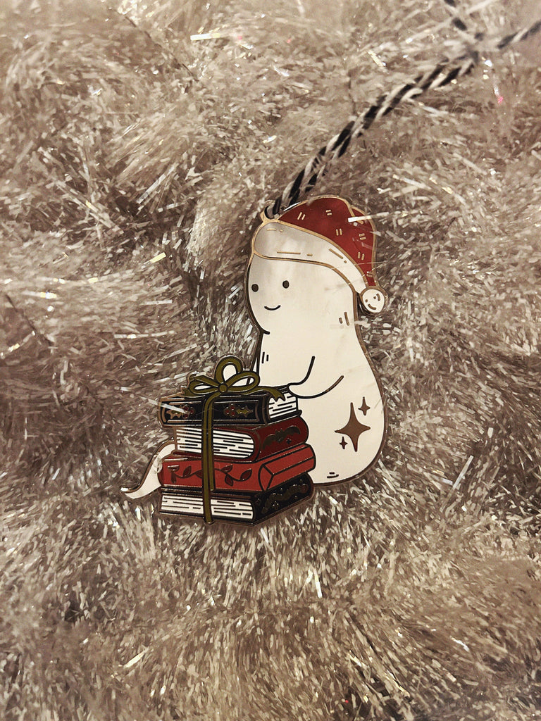 A Little ghost with their stack of gifted books. This ornament is 3.25 inches tall. Made of hard enamel, will last forever! Comes with a festive black and white ribbon.